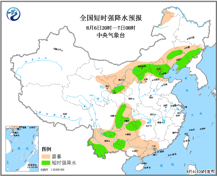 另外,华北西南江南等地将有强对流天气。预计8月6日08时至7日08时,河北中北部、北京、天津、山西中北部、内蒙古中部和东部、甘肃中部、四川东部、重庆、湖南、贵州、广西、广东、云南中南部等地的部分地区将有短时强降水天气,小时雨强20-50毫米,局地可达60毫米以上;另外,内蒙古中部等地的部分地区将有雷暴大风或冰雹天气。