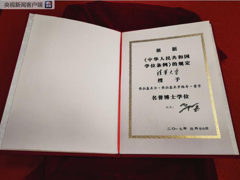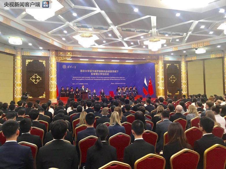 清华大学在这里为普京举行了隆重的仪式,授予他名誉博士学位。