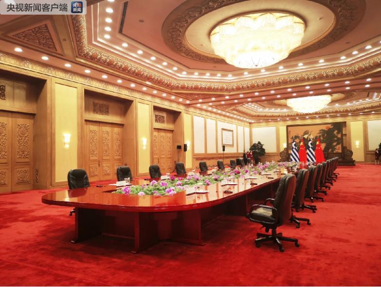 △习近平和希腊总理齐普拉斯在人民大会堂东大厅举行会谈。(央视记者张晓鹏拍摄)