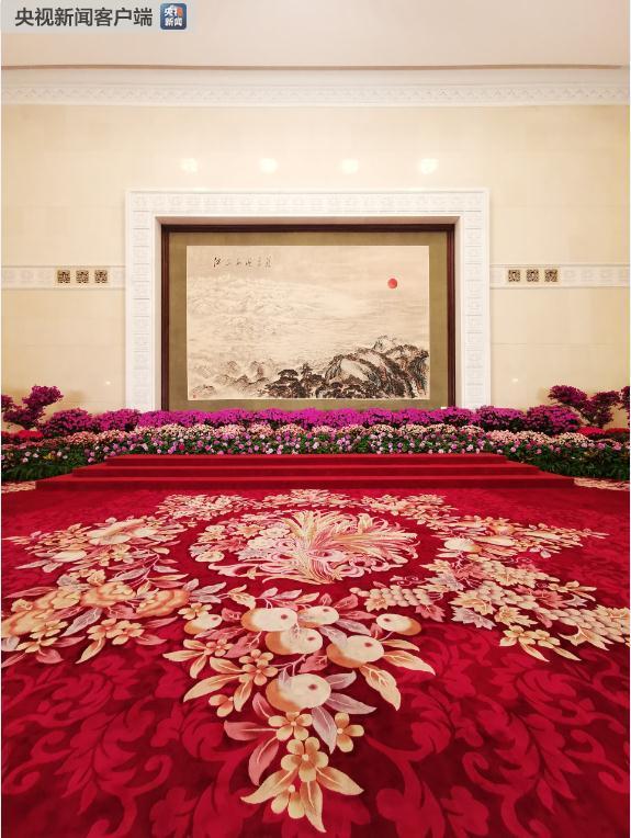 △迎宾仪式在人民大会堂二层巨幅山水画《江山如此多娇》前举行。《江山如此多娇》是中国当代画家傅抱石和关山月以毛泽东的《沁园春·雪》为题材,于1959年合作创作的。(央视记者张晓鹏拍摄)
