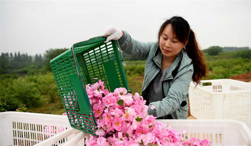 4月28日,紫蓬镇新农村农民将采摘的玫瑰花集中起来。 近年来,安徽省肥西县紫蓬镇积极调整农业产业结构,发展以玫瑰花种植及深加工为特色的生态休闲农业,以花为媒,助力乡村振兴。 新华社记者 刘军喜 摄