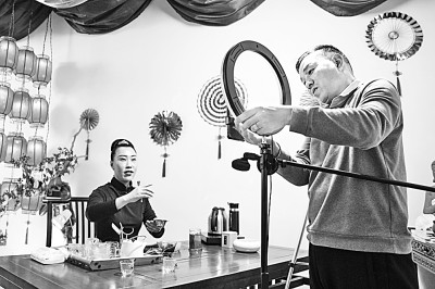 山东省济南市长清区孝里街道居民正在直播卖货。新华社发