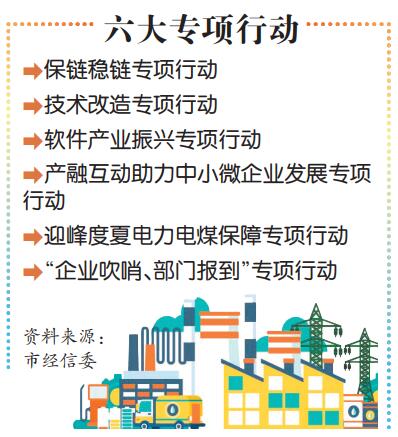 这六大专项行动包括保链稳链专项行动、技术改造专项行动、软件产业振兴专项行动、产融互动助力中小微企业发展专项行动、迎峰度夏电力电煤保障专项行动和“企业吹哨、部门报到”专项行动。