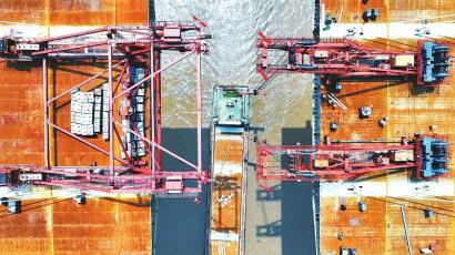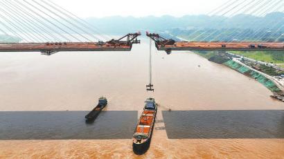 往大桥中间走,只见此前远处见到的“小”缺口,原来足有数十米宽。对岸,架设在桥面缺口部位的架桥机垂下了钢索,沿长长的钢索看去,一条装有钢箱梁节段的船舶停在缺口下方处的江面上,几名工人正在钢箱梁节段上固定钢索挂钩。“钢箱梁节段最重达587吨,在重庆出厂后经水路运到这里。”敬元猛说,安装一个钢箱梁节段有吊装、精调、焊接、挂索等环节,需一周左右时间。根据施工安排,预计本月底,大桥主桥就可合龙。