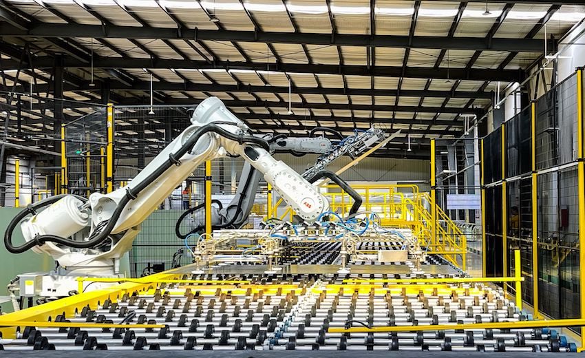 自贡市沿滩区凯盛新能源公司太阳能材料生产车间,机械手将光伏玻璃从辊道上依次取下。自贡市委宣传部供图