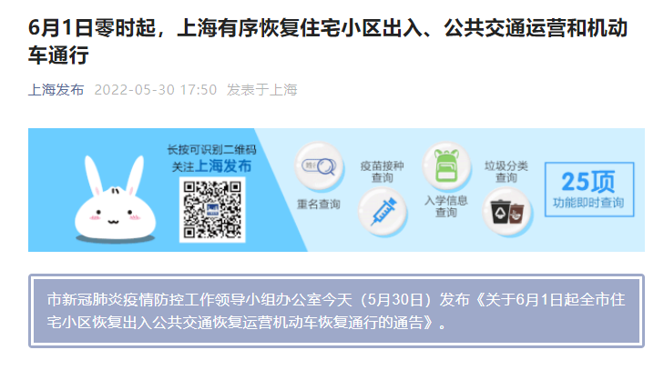 上海市新冠肺炎疫情防控工作领导小组办公室今天(5月30日)发布《关于6月1日起全市住宅小区恢复出入公共交通恢复运营机动车恢复通行的通告》。
