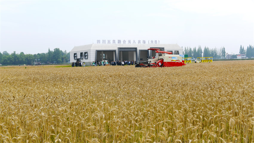 无人驾驶收获机在田间收获小麦。大邑县委宣传部供图