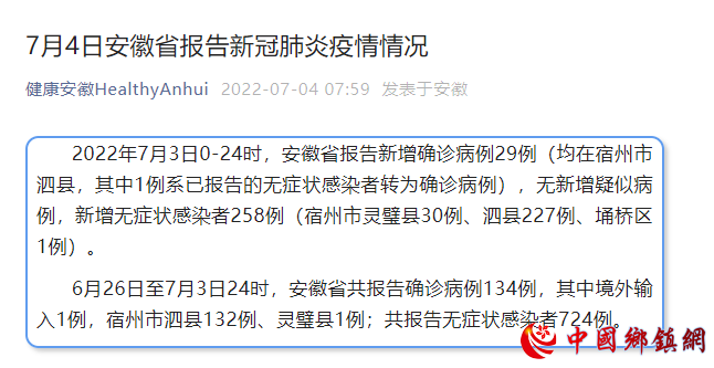 2022年7月3日0-24时,安徽省报告新增确诊病例29例(均在宿州市泗县,其中1例系已报告的无症状感染者转为确诊病例),无新增疑似病例,新增无症状感染者258例(宿州市灵璧县30例、泗县227例、埇桥区1例)。