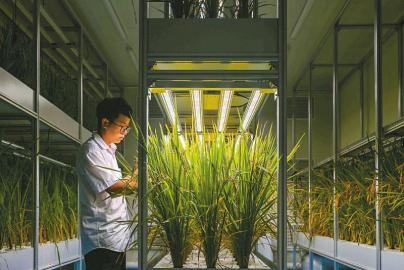 这座现代化的植物工厂不仅培育有水稻,还培育了小麦、大豆、玉米等粮食作物,以及常见的生菜、椿芽、小白菜等多种蔬菜。光环境是这座植物工厂内最核心的部分,也是中国农业科学院都市农业研究所党委书记、副所长杨其长及其团队攻克的难题。阳光中包含赤橙黄绿青蓝紫7种可见光和紫外线等光谱,其中的红、蓝光对植物光合作用促进最大,其他光谱对植物的开花、结实和色素形成也具有独特的功能。“我们的很多次试验都失败了,植物要么被‘晒’死,要么长势不行。”经过不断的摸索,杨其长团队首次在国际上提出了植物“光配方”的概念,并突破多项核心技术,终于让LED能以不同的光谱配方,针对不同作物进行精准供光,创造出光强、光质、光周期可调的人工光环境条件,提升了光能利用效率,降低了生产能耗。