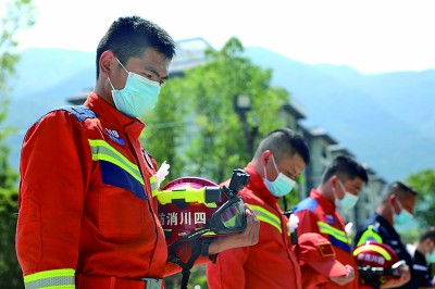 9月12日,在雅安市石棉县,参加悼念活动的人员为遇难同胞默哀。新华社记者 刘琼摄