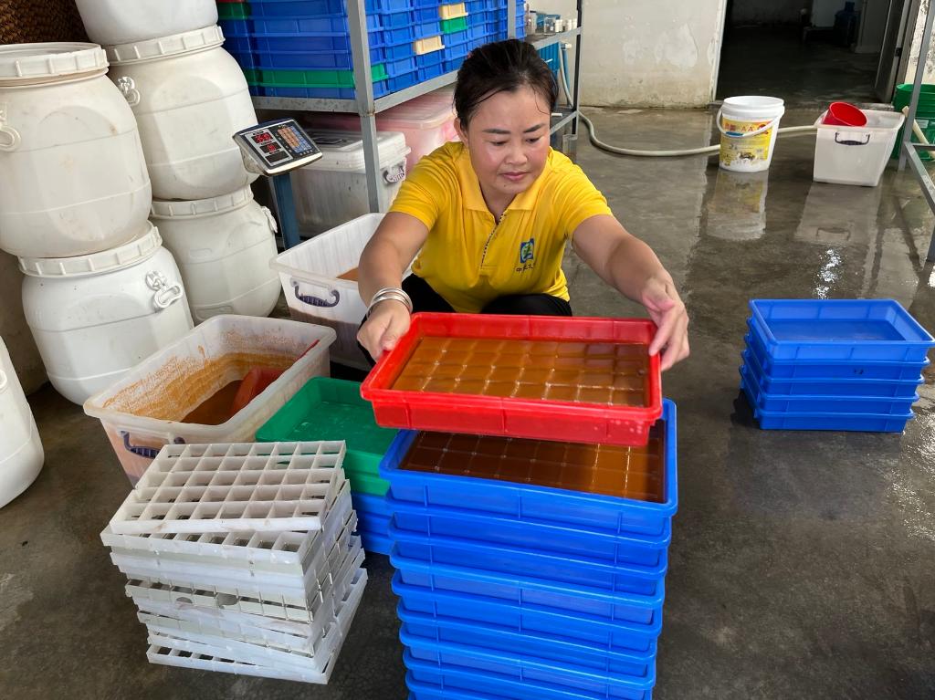 农作物制种正忙,水产种苗繁育也迎来高峰。在新龙镇,海南中正水产科技有限公司保种、育种、育苗等车间忙碌有序。在饵料车间,工人将丰年虫饵料放入塑形板,经过冷冻后成为一个个冻块,便于解冻后定量投喂。