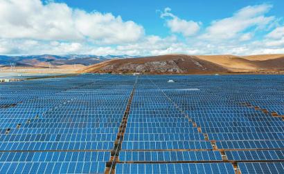 100多万块光伏板在这片海拔4000米的高原上依山势逐光而列,连绵起伏。
