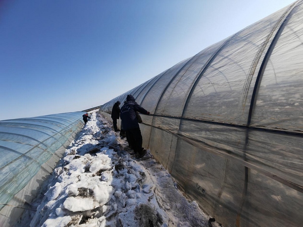 佳木斯市农技推广中心技术人员指导农户清雪扣棚。佳木斯市委宣传部供图