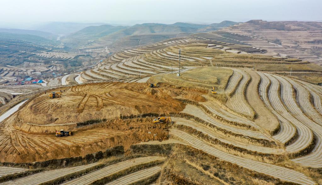 大地回春,宁夏西海固山区旱塬上依然乍暖还寒。在宁夏固原市西吉县硝河乡苏沟村,山间梯田如同大地的“指纹”,15台大型机械正加紧作业,多台推土机轰鸣并进,将几道较窄梯田合并推成更宽、更长的梯田。