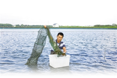 昆山市巴城镇联民村村民邹建星在捕捞螃蟹。 |