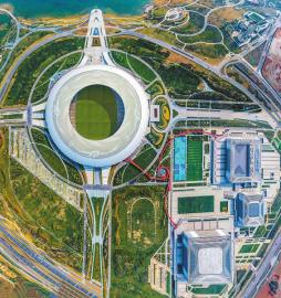 俯瞰东安湖体育公园中4万座的大型甲级体育场。体育场呈飞碟形态,屋面设计有44.5米宽的“太阳神鸟”图案,展现巴蜀文化特色。
