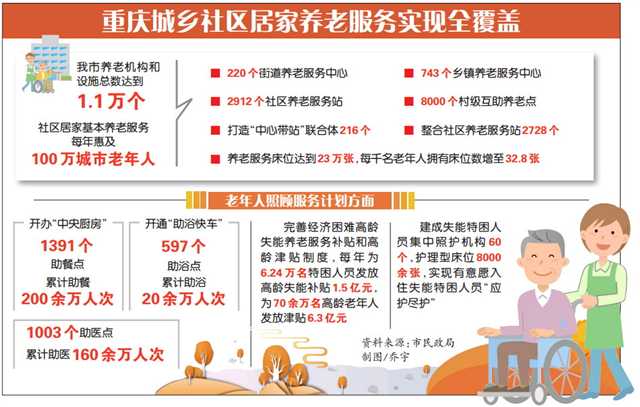 5月11日,全市基本养老服务体系建设推进会暨“渝悦养老”“精准保障”行动动员部署会召开。记者从会上获悉,我市已实现城乡社区居家养老服务全覆盖,建成街道养老服务中心220个、乡镇养老服务中心743个、社区养老服务站2912个,设置村级互助养老点8000个。目前我市养老机构和设施总数达到1.1万个,养老服务床位达到23万张,每千名老年人拥有床位数增至32.8张。