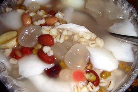 清补凉是一种夏天清热补湿的食品,且甘甜爽口,是夏季必备的饮品。在海南的冬天也可以吃到热的清补凉。原料少则十几种,多则二十几种,其中新鲜椰肉和菠萝是海南特色水果、葡萄干是北方特色食品,通心粉是西式食品,原料千变万化。最受欢迎的是椰子水清补凉和椰奶清补凉。椰子水的清甜伴着绿豆、西瓜、薏米的味道,又是别样滋味。在海南炎热的傍晚,喝上一碗冰爽的清补凉实在是最惬意的事情。