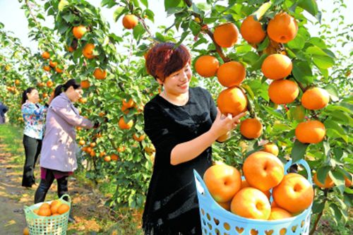 梨农在宁陵县黄岗镇的有机果园里采收黄金雪梨鲜果。深秋时节,中国酥梨之乡——宁陵县万亩梨园硕果累累,金黄色的梨果压弯了枝头,好一派丰收喜人的景象。