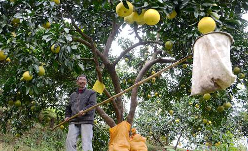 人民网重庆11月27日电 当前,在重庆市梁平区虎城镇砂石社区7组梁平蜜柚基地里,十分热闹,数名村民正在忙着采摘成熟的梁平蜜柚,脸上洋溢的笑容折射出今年的好收成。据了解,虎城镇位于重庆市梁平区西北部,全镇土地肥沃,尤以梁平蜜柚驰名,其皮薄肉厚、汁多化渣、味甜微酸,深受人们喜爱。(胡虹 陶开星)