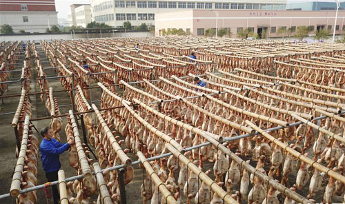 12月4日,在浙江省东阳市花园村浙江老汤火腿食品有限公司厂区晒场上,工作人员在晒制火腿。