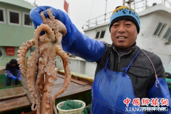 12月15日,在青岛沙子口中心渔港码头,一名渔民展示捕获的章鱼。
