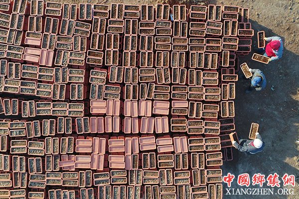 12月20日,河北省南宫市蓬勃黄韭产业有限公司工人在室外摆放黄韭盆景。