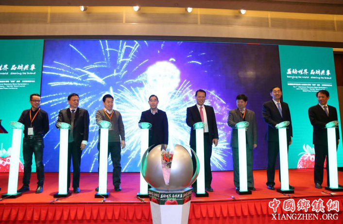 最后,全国政协委员、中国优质农产品开发服务协会会长朱保成,中国检验检疫学会顾问侯玲林,中国果品流通协会副会长张庆丰,国际农业协会联盟秘书长刘友法,江苏省农业委员会主任吴沛良,南京市农业委员会主任方中友、溧水区委书记谢元和优果联品牌管理有限公司总经理谢凌云上台,启动首届国际草莓品牌大会。