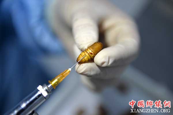 12月31日,河北省巨鹿县一家蛹虫草生产企业的工人为活体蚕蛹注射虫草菌种。