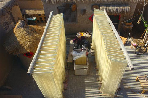 2月5日,路林昌和妻子张增喜准备晾晒坠面。春节临近,山东省高唐县姜店镇西郭村传统坠面手艺人路林昌和妻子张增喜的生意格外红火。坠面又称空心面,面条细如针尖,经过和面、抻面15道工序制成,在晾晒时会自然形成空心。新华社发(赵玉国 摄)