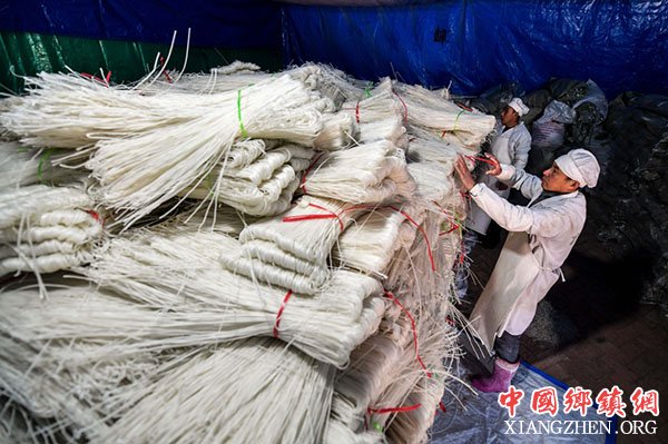 在吉林省通榆县育林村,村民在库房内检查打包成捆的马铃薯粉条(2月12日摄)。