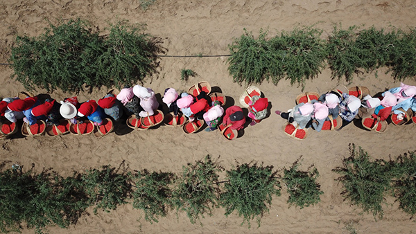 红寺堡生态移民区的移民在百瑞源枸杞种植基地排队将采摘的枸杞称重(5月30日无人机拍摄)。