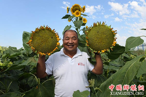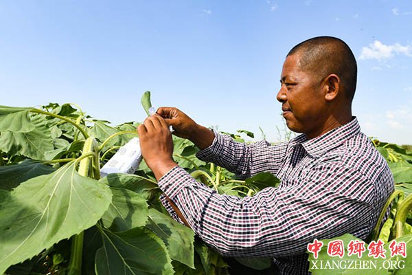 8月23日,内蒙古自治区五原县种植户张忠贵在自家的葵花地里。通过与企业签订订单实施标准化种植,他家葵花籽每亩产量更高。