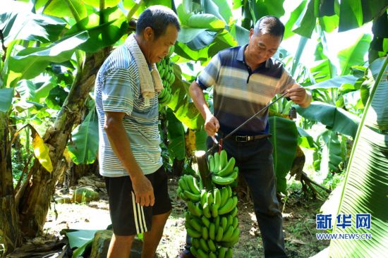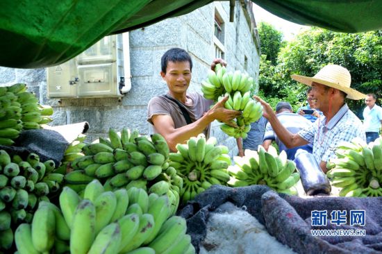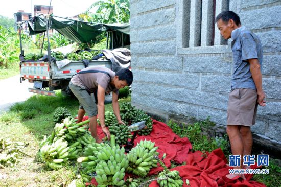 水果批发商蔡峻琪(左)时常来到建兴村收购成熟的小米蕉,最多时一天可以收购2000多公斤。新华网 王雄 摄
