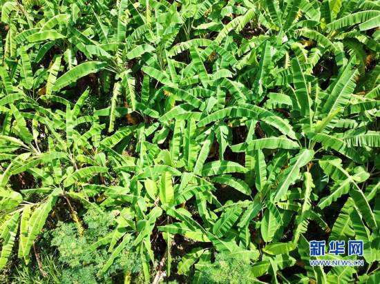 从近处俯瞰香蕉林,成熟的小米蕉在青绿色的林间若隐若现。新华网发(林楷煜 摄)