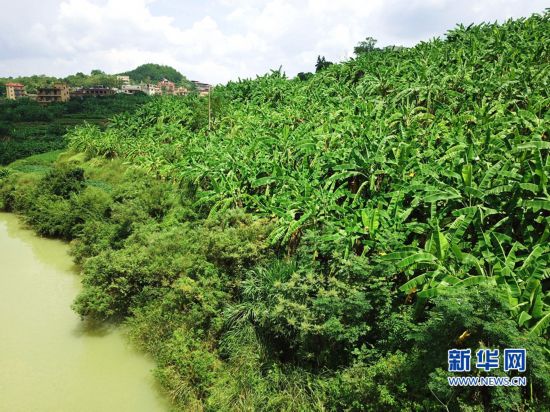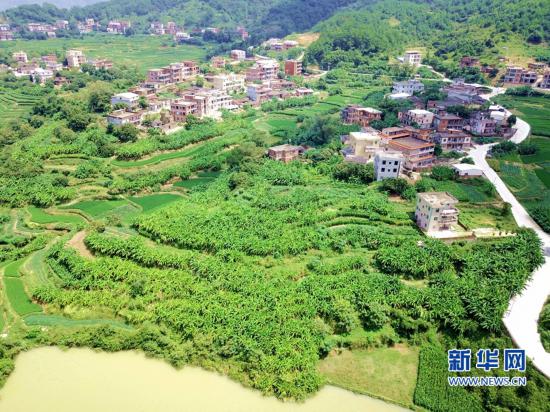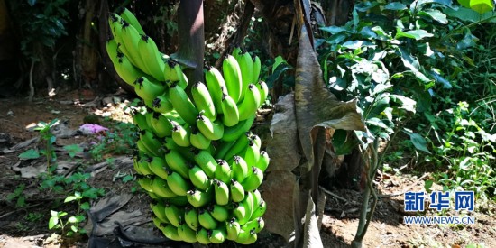 漫步于建兴村,随处可见小米蕉沉甸甸地挂在树上,仿佛宣告着丰收的喜讯。新华网 王雄 摄