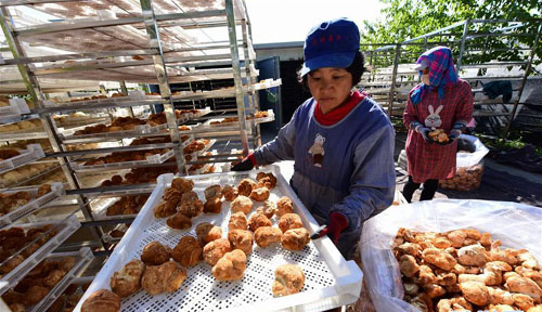 9月10日,在黑龙江省海林市海林镇模范村,当地菌农分拣机械化烘干的猴头菇。 近日,位于黑龙江省东南部的海林市迎来猴头菇的大范围采收季。当地菌农在合作社的组织下,利用晴好天气,抓紧采收、烘干猴头菇。 新华社发(张春祥 摄)