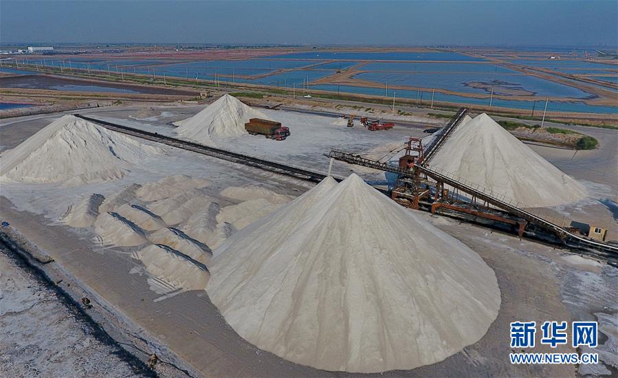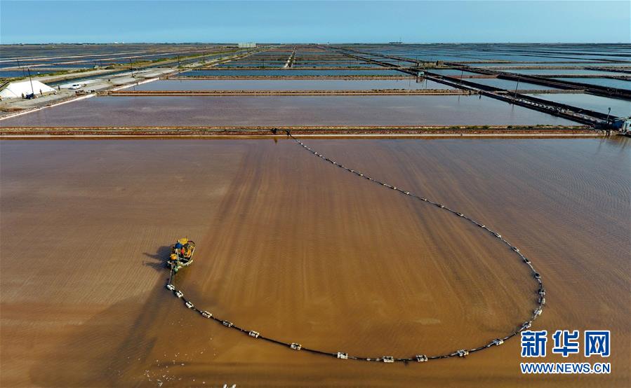 近日,河北省唐山海港经济开发区长芦盐区大清河盐场的秋盐收获工作全面展开,今年预计海盐总产量将达53万吨。 新华社记者 杨世尧 摄
