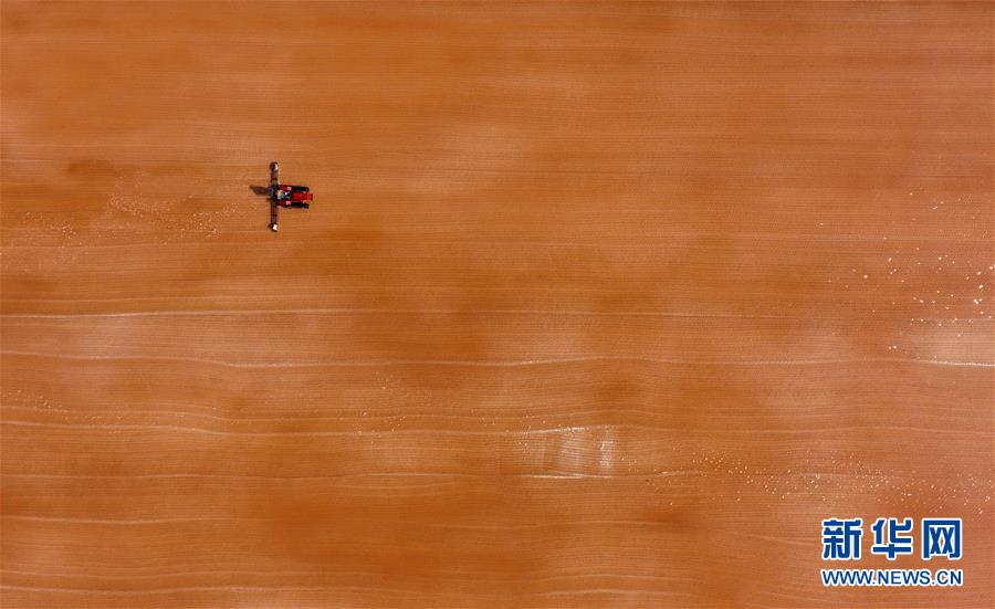 9月10日,长芦盐区大清河盐场的机械设备在进行秋盐收获作业(无人机拍摄)。新华社记者 杨世尧 摄