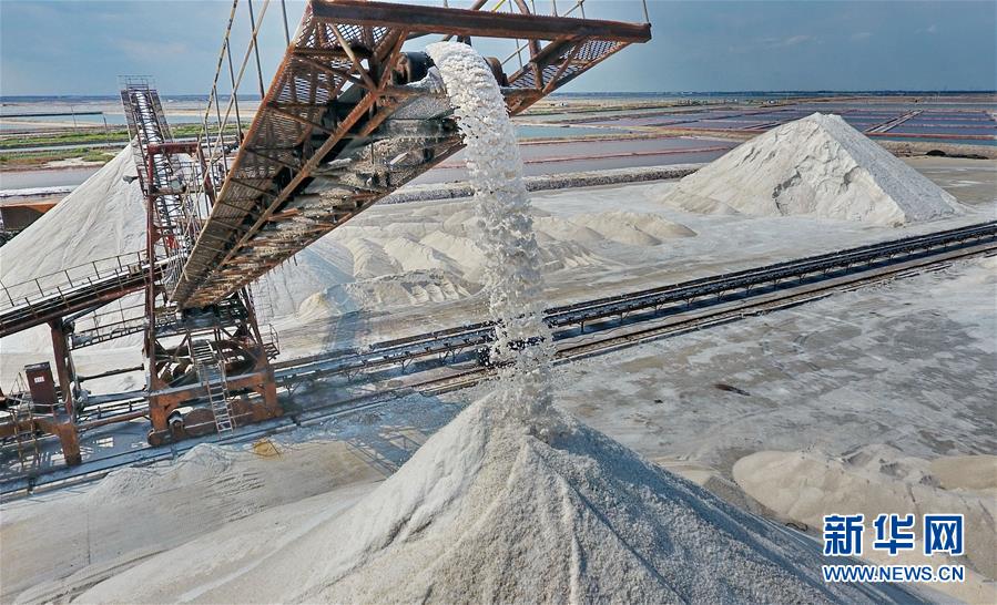 9月10日,长芦盐区大清河盐场的工人在操作机械设备收获秋盐(无人机拍摄)。新华社记者 杨世尧 摄