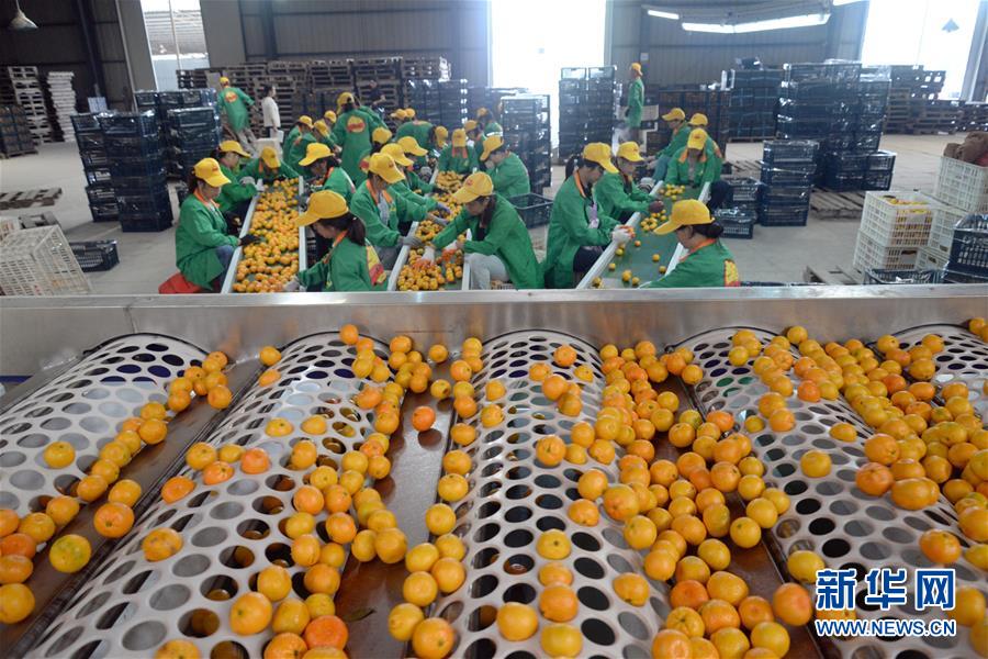 10月8日,在南丰县傅坊乡梅林村,一家果品厂的工人在筛选出口国外市场的南丰蜜橘。