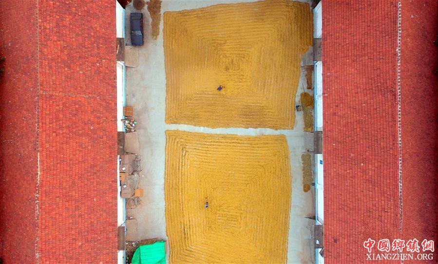 10月8日,农民在贾寨镇后寨村晾晒大豆(无人机拍摄)。
