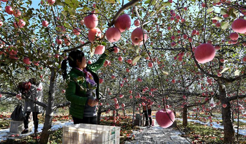 10月10日,山西省临汾市吉县吉昌镇山阳村的果农在果园里采摘苹果。 近年来,山西省临汾市吉县推动苹果产业提质升级。目前全县苹果种植面积达28万亩,果农的果品收入占纯收入的80%以上,苹果产业成为当地农民的致富产业。 新华社记者 杨晨光 摄