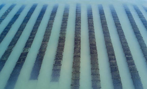 近日,福建省各地陆续进入紫菜采收季节。在福建省石狮市,待收的紫菜在涨潮的海面上若隐若现,形成独特的景观。 新华社记者 宋为伟 摄