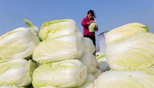 11月27日,江苏省盱眙县淮河镇蛤滩村菜农刘西梅在包装大白菜。近日,江苏省淮安市盱眙县淮河镇“海外订单”冬储大白菜成熟上市,当地农民抢收、装运大白菜外运。自2016年开始,淮河镇与韩国、日本客商签订大白菜出口订单,实施“海外订单”蔬菜种植模式,带动菜农增收。新华社发(周海军 摄)