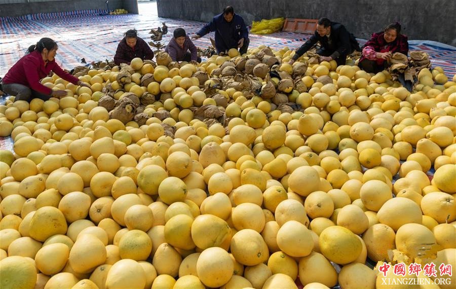 12月13日,秭归县磨坪乡升坪村农民在对刚采摘的“磨坪贡柚”进行整理,准备出售。