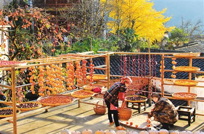 江西婺源篁岭村,村民将红彤彤的柿子挂在庭院 |