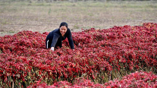 10月16日,宝丰县闹店镇周营村的村民在晾晒辣椒。 当日,河南省宝丰县迎来晴好天气,闹店镇周营村的村民抓紧时间抢收抢晒“订单辣椒”,以确保品质。近年来,宝丰县闹店镇因地制宜发展辣椒种植业,村民收获的辣椒通过订单销售的方式销往外地,带动当地农户尤其是贫困户增收。 新华社记者 李嘉南 摄