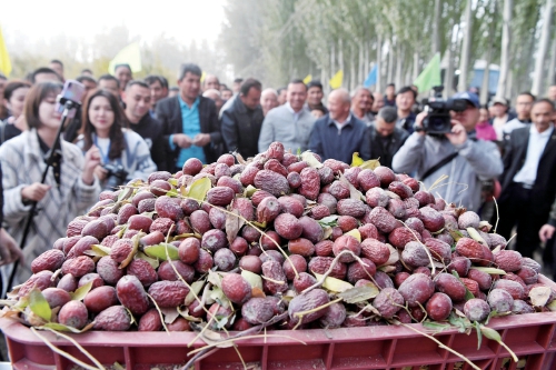 10月19日,新疆且末县英吾斯塘乡阿瓦提村有机红枣园开展红枣采摘及直播代言活动,通过在枣园举行打枣仪式、客人现场采摘等活动庆丰收。新华社记者 沙达提 摄