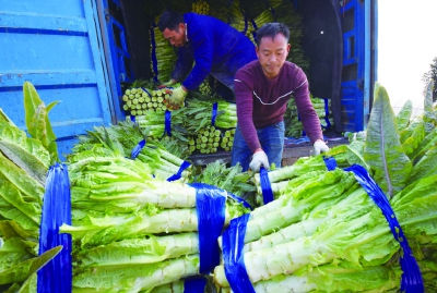 1月14日,安徽省宿州市埇桥区顺河乡兴农瓜菜专业合作社社员正在装运红叶香笋莴苣。春节临近,埇桥区的30余万亩优质红叶香笋莴苣开始上市,目前,远销江苏、河南、湖北、上海、浙江、北京等地,农民亩收入在6500元左右。祝家刚李纯朴摄